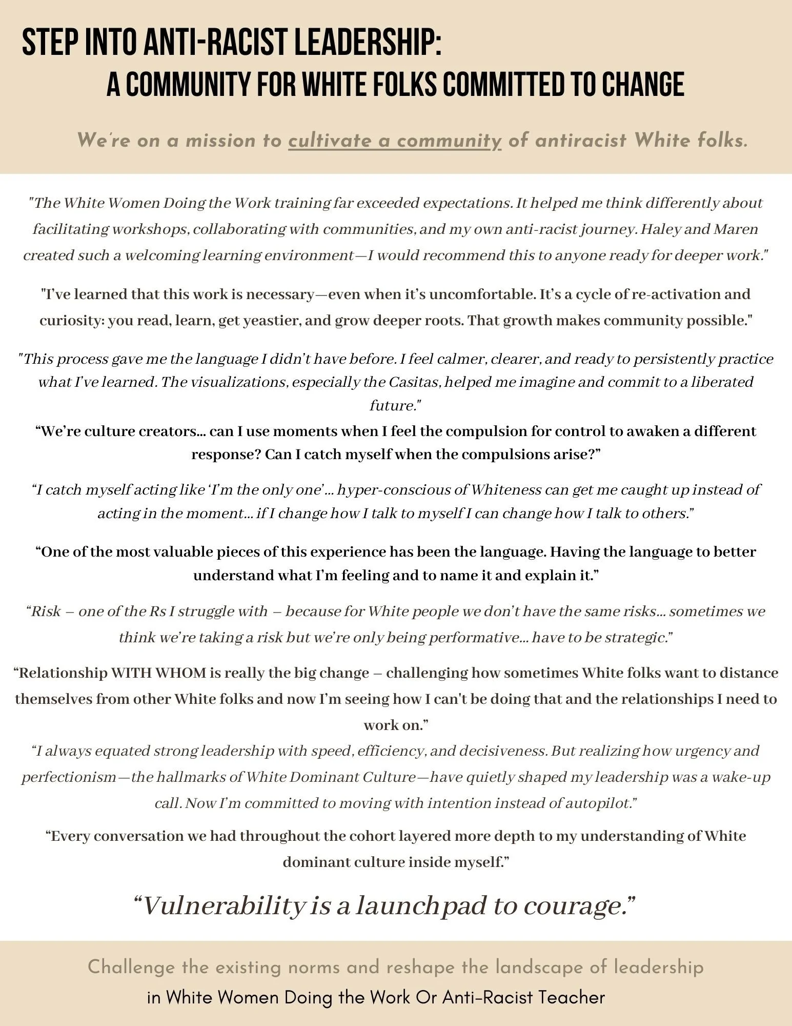 This is “101 ½” and an entry point to engage in the White antiracist community we’re cultivating . It’s a new page in your racial identity development journey to interrogate perfectionism, fear of doing it wrong, and how you’ve been told there is a right way to professionalism and leadership. It’s an invitation for nuance, complexity, power sharing, collaboration and vulnerability.